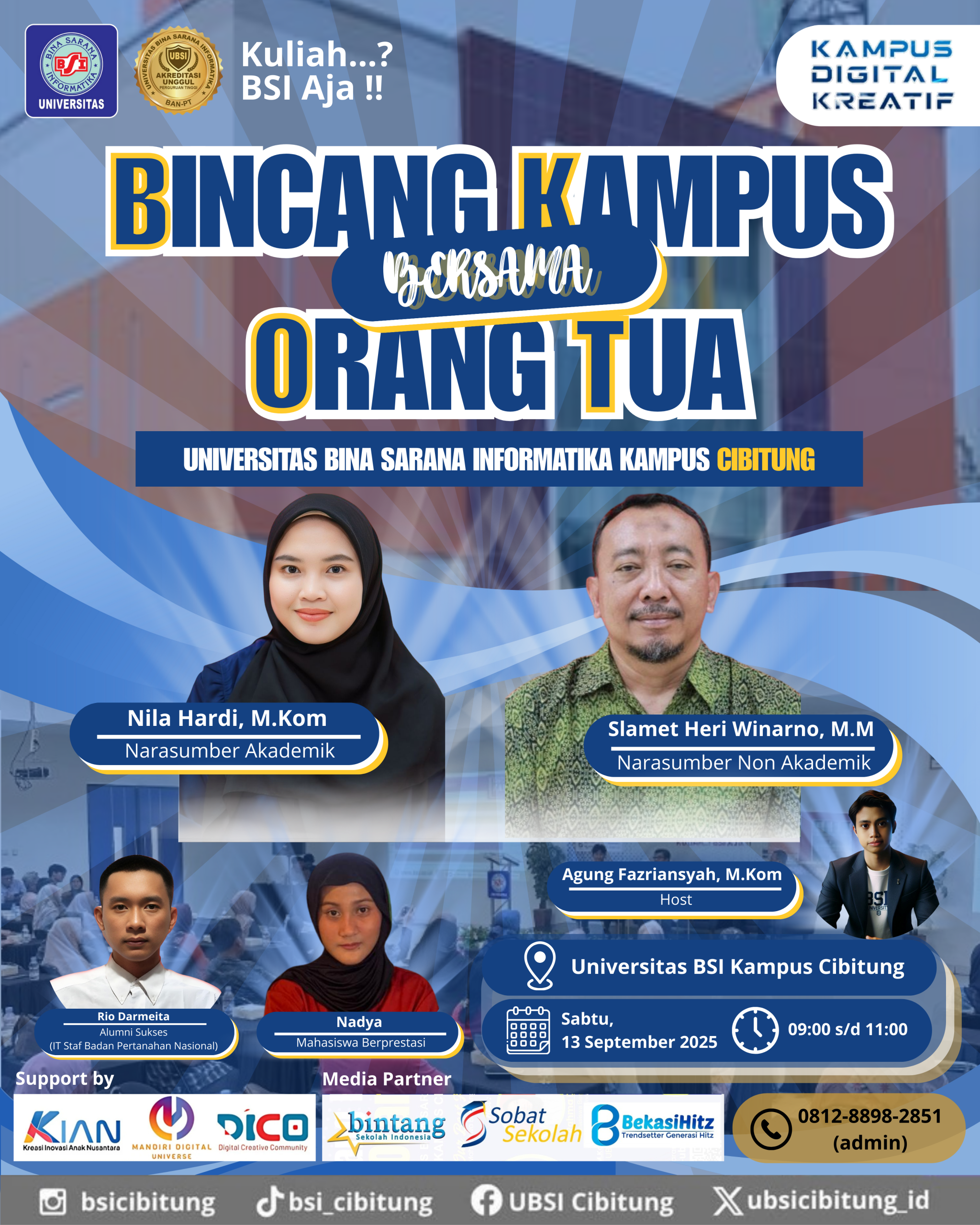 Acara ini dipandu oleh Agung Fazriansyah, M.Kom sebagai host yang menghidupkan suasana diskusi. Turut hadir pula Rio Darmieta, alumni sukses UBSI yang kini berkarier sebagai IT Staf di Badan Pertanahan Nasional, Nadya sebagai mahasiswa aktif berprestasi dari UBSI Cibitung dan para Orang tua mahasiswa baru angkatan 2025 yang mengikuti acara secara langsung di kampus.