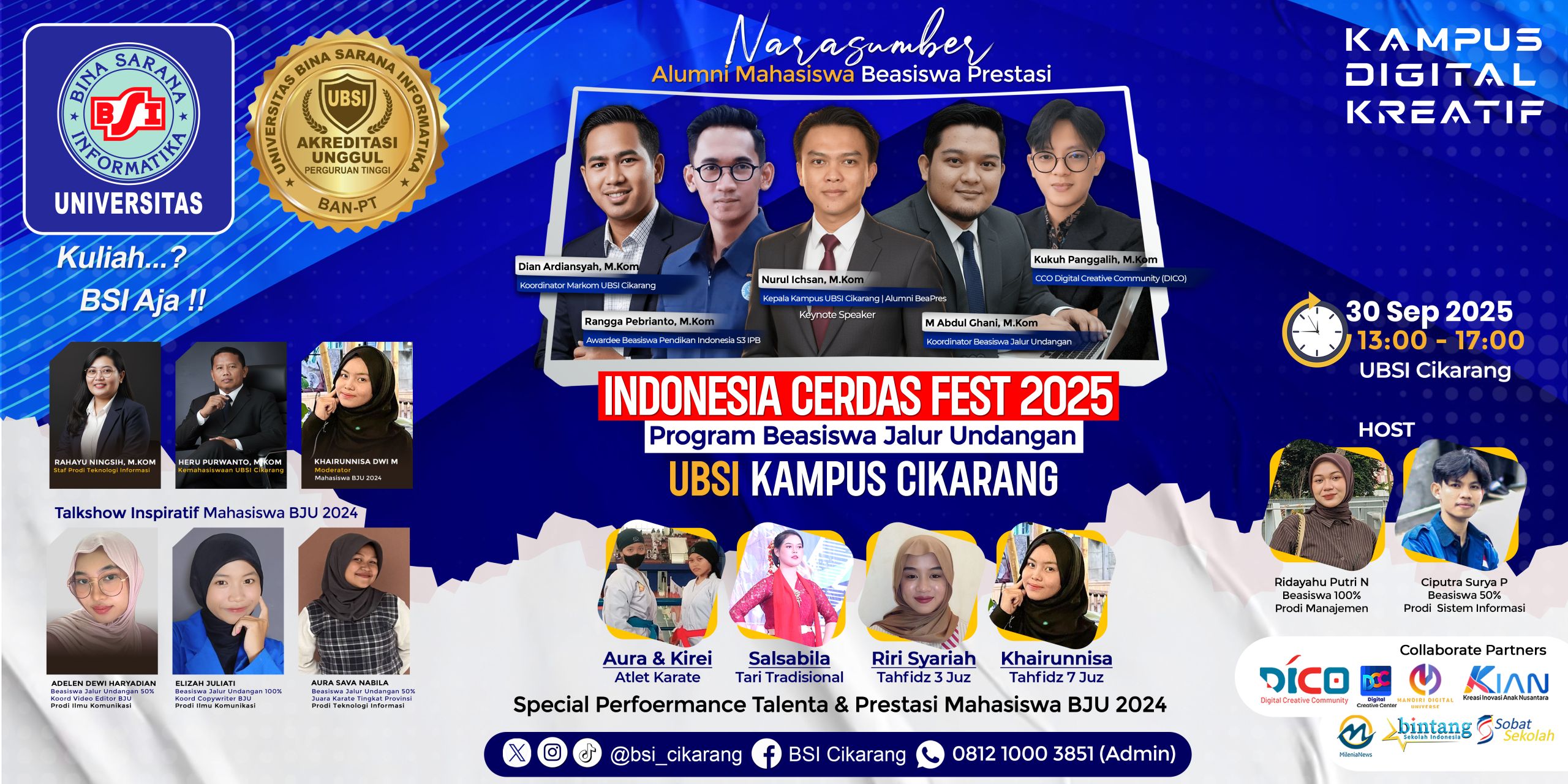 Saatnya generasi muda melompat lebih tinggi! Universitas Bina Sarana Informatika (UBSI) Kampus Cikarang kembali menghadirkan event akbar yang penuh inspirasi: Indonesia Cerdas Fest 2025, sebuah momentum emas bagi para calon mahasiswa, pelajar, dan generasi muda yang haus prestasi.