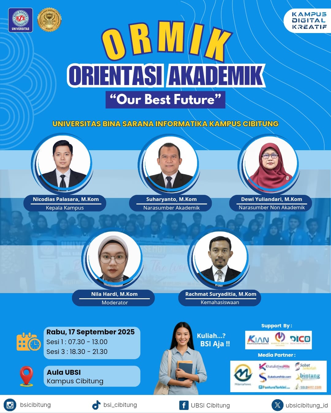 ORMIK ini wajib diikuti oleh seluruh mahasiswa baru UBSI Kampus Cibitung, khususnya kamu yang sudah mendaftar di prodi Sistem Informasi, Teknologi Informasi, Manajemen, dan Ilmu Komunikasi.