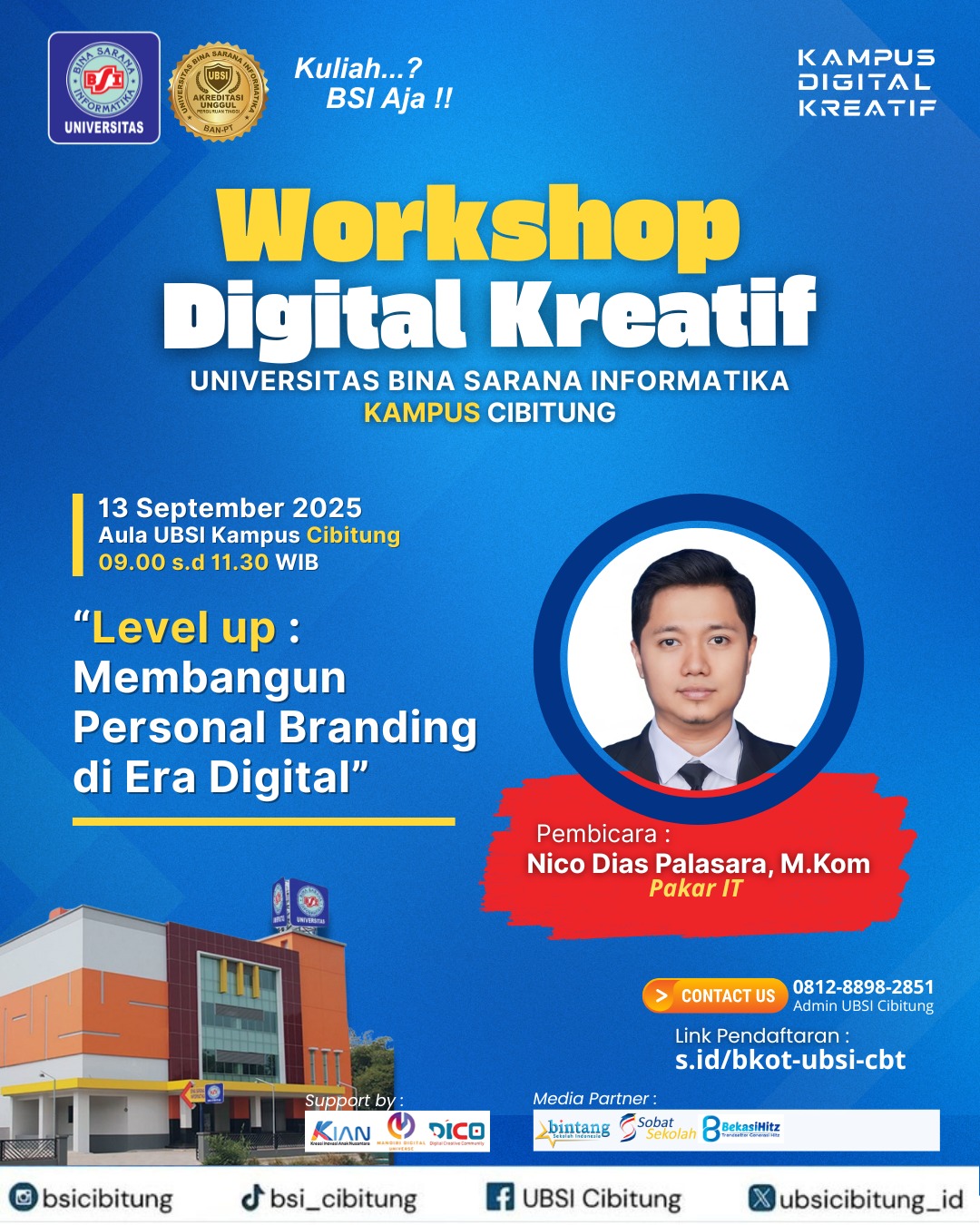 Workshop ini membahas strategi dan tips membangun personal branding secara efektif di era digital. Materi disampaikan oleh narasumber berkompeten, Bapak Nico Dias Palasara, M.Kom, seorang pakar IT sekaligus Kepala Kampus UBSI Cibitung, yang berpengalaman dalam dunia digital kreatif dan branding personal.